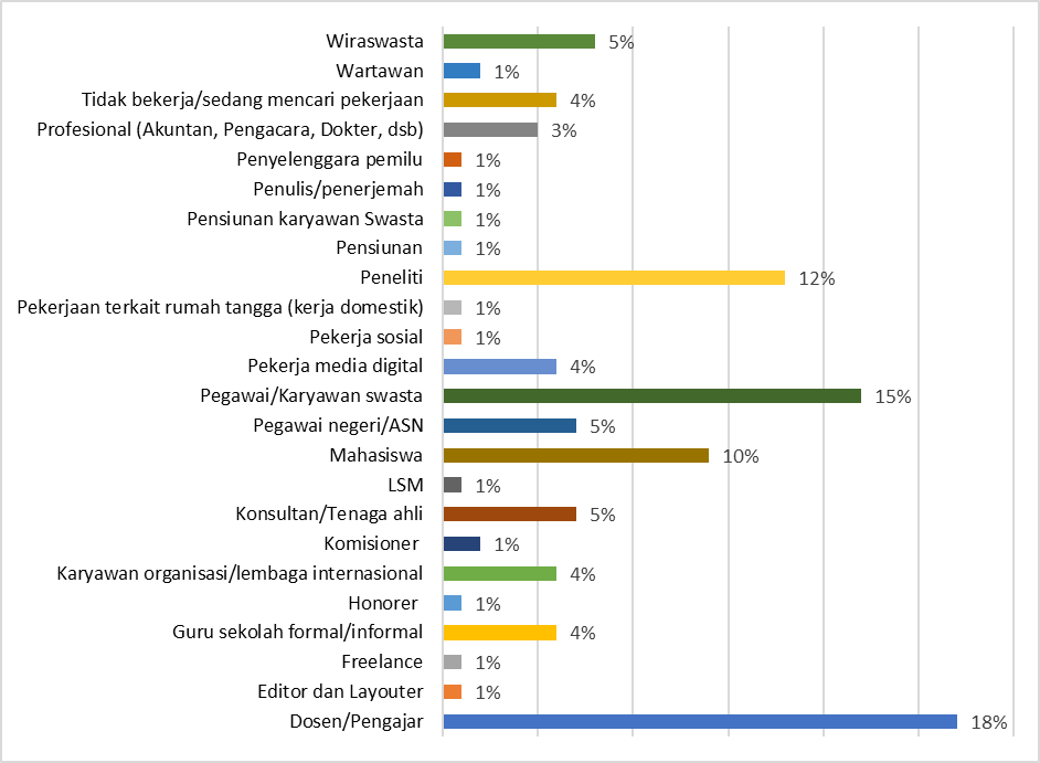Sejalan dengan itu, mayoritas pengisi angket memiliki latar belakang pendidikan perguruan tinggi. Sementara itu, pekerjaan dari mereka yang mengenal Prisma didominasi oleh tiga jenis pekerjaan utama, yaitu staf pengajar/dosen di universitas, peneliti/periset (termasuk konsultan, tenaga ahli dan profesional) dan karyawan swasta. Itu menunjukkan bahwa latar belakang pendidikan mayoritas pembaca Prisma berhubungan erat dengan jenis pekerjaan yang mereka geluti.